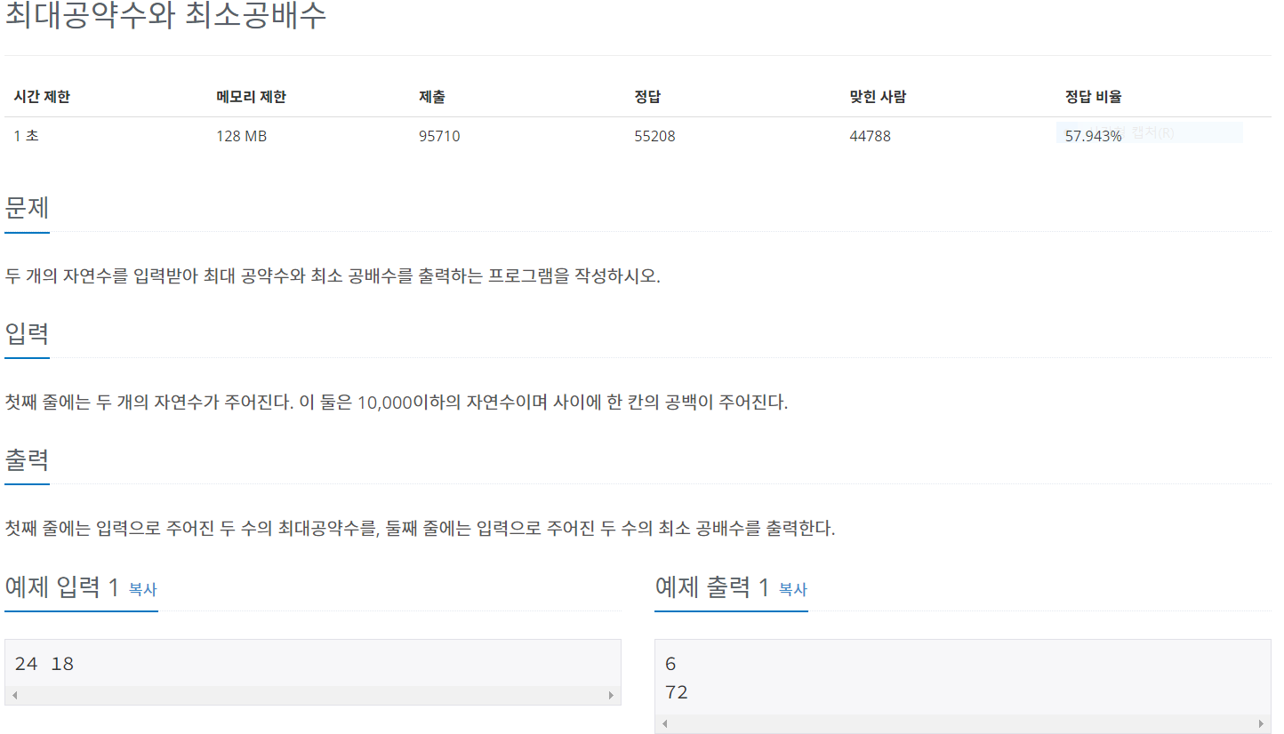 최대공약수와 최소공배수라는 단어를 진짜 오랜만에 듣는다. 어떻게 구하는지도 기억이 가물가물하다.