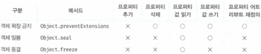 → 객체의 중첩 객체까지 동결하려면 객체를 값으로 갖는 모든 프로퍼티에 대해 Object.freeze 메서드를 호출해야 함