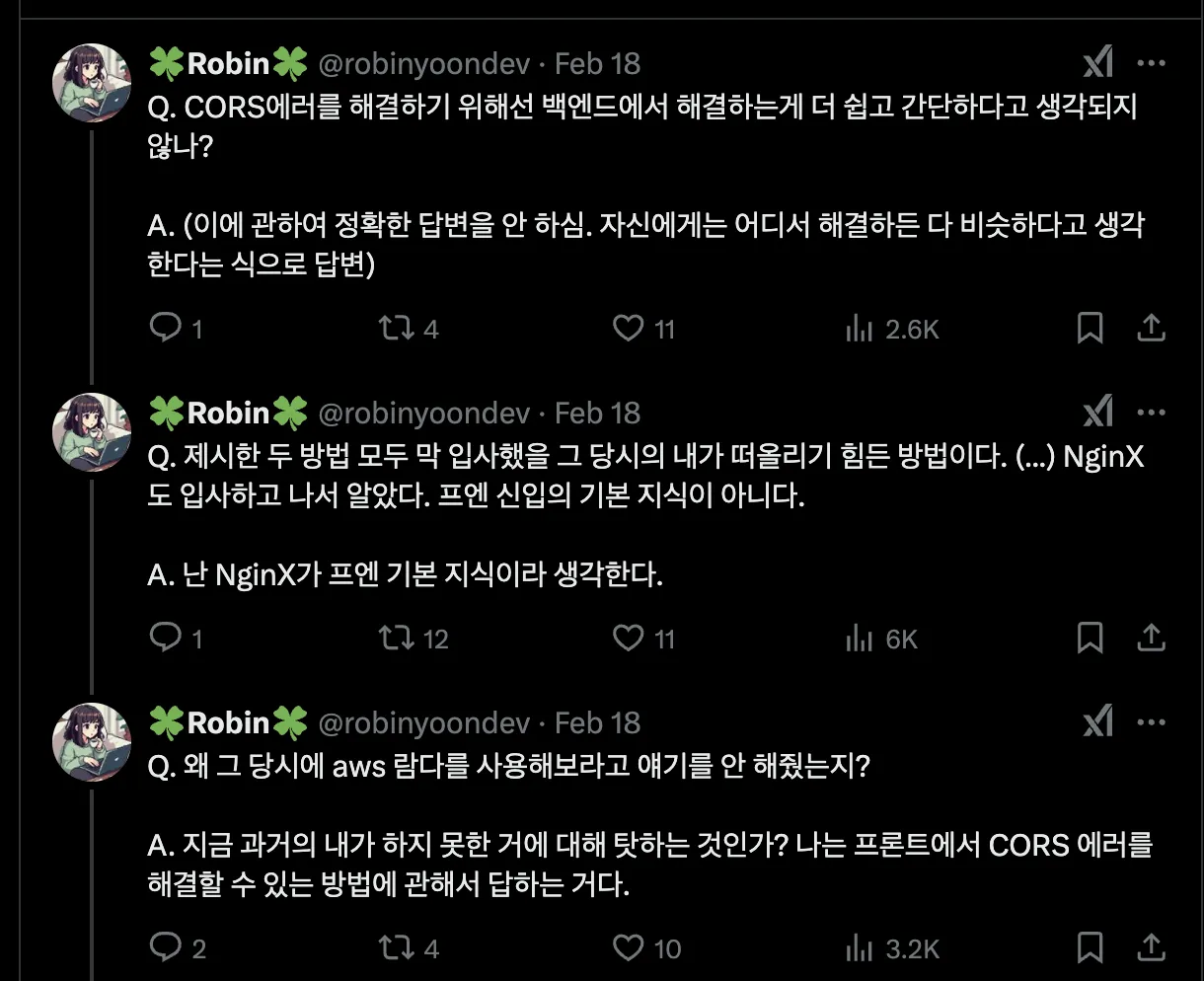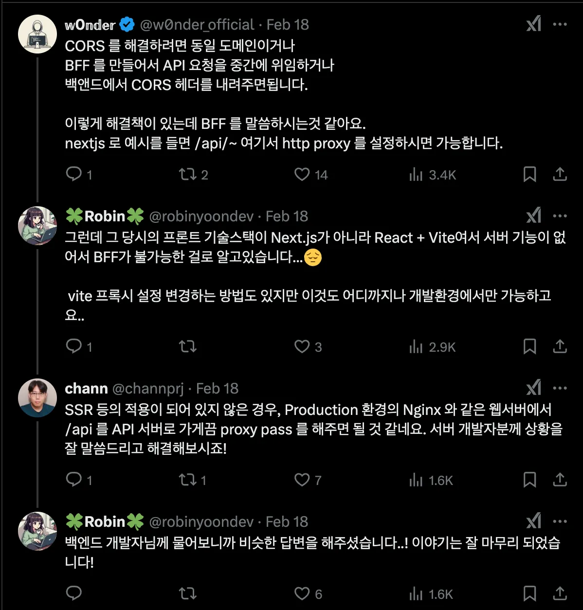 결국, 위 트윗에서 CORS 에러는 백엔드 개발자분께서 해결해주시는 게 더 낫지 않았을까 하는 생각이 든다.