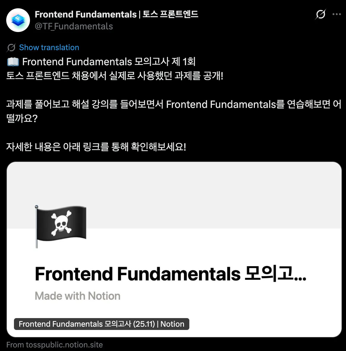 그리고 몇년이 지나, 모의고사와는 연을 끊은지 오래된 나에게 우연히 웹 프론트엔드 모의고사가 실시된다는 소식을 들었다. 웹 프론트엔드도 모의고사가 있다고? 트윗을 살펴보니 토스 프론트엔드 채용에서 실제로 사용했던 과제를 모의고사로 출제한다고 써져있었다. 토스에 지원해본적이 없어서 과연 어떤 과제가 나올 지 궁금했다. 또 웹 프론트엔드 일을 하며 거의 매일 코딩을 하지만 내가 과연 올바른 코딩을 하고 있는지 스스로를 의심할 때가 종종 있는데, 이번 기회를 통해 의심에 대한 답변을 할 수 있을까하는 기대도 있었기에 모의고사에 응모하기로 다짐했다.