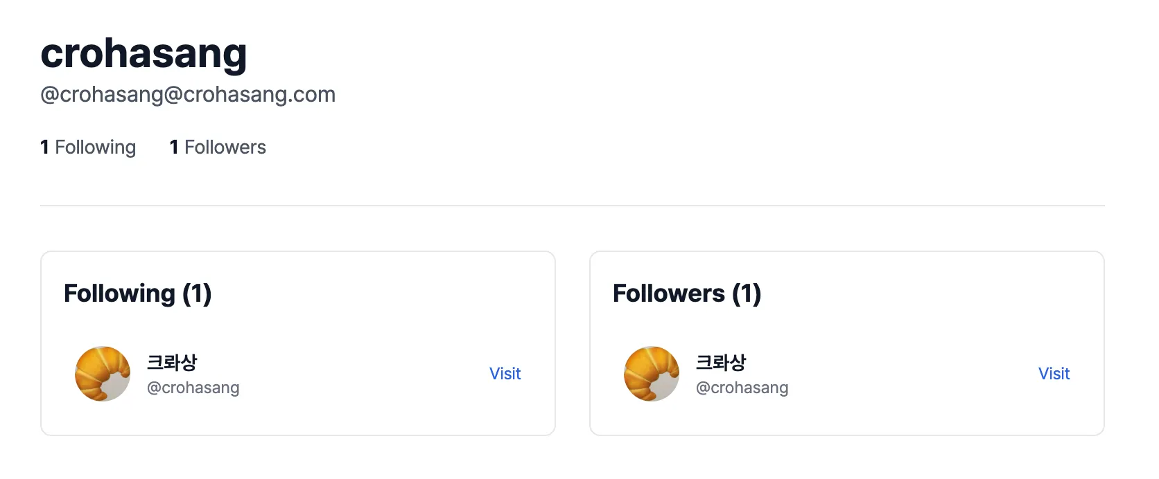 이제 실제로 팔로우 기능이 작동하는지 확인해보았다. 내 웹 사이트 계정(@crohasang@crohasang.com)과 해커스펍 계정(@crohasang@hackers.pub)을 서로 맞팔로우했다. 그리고 내 웹 사이트에서 팔로워와 팔로잉 목록이 제대로 표시되는지 확인해보았다.