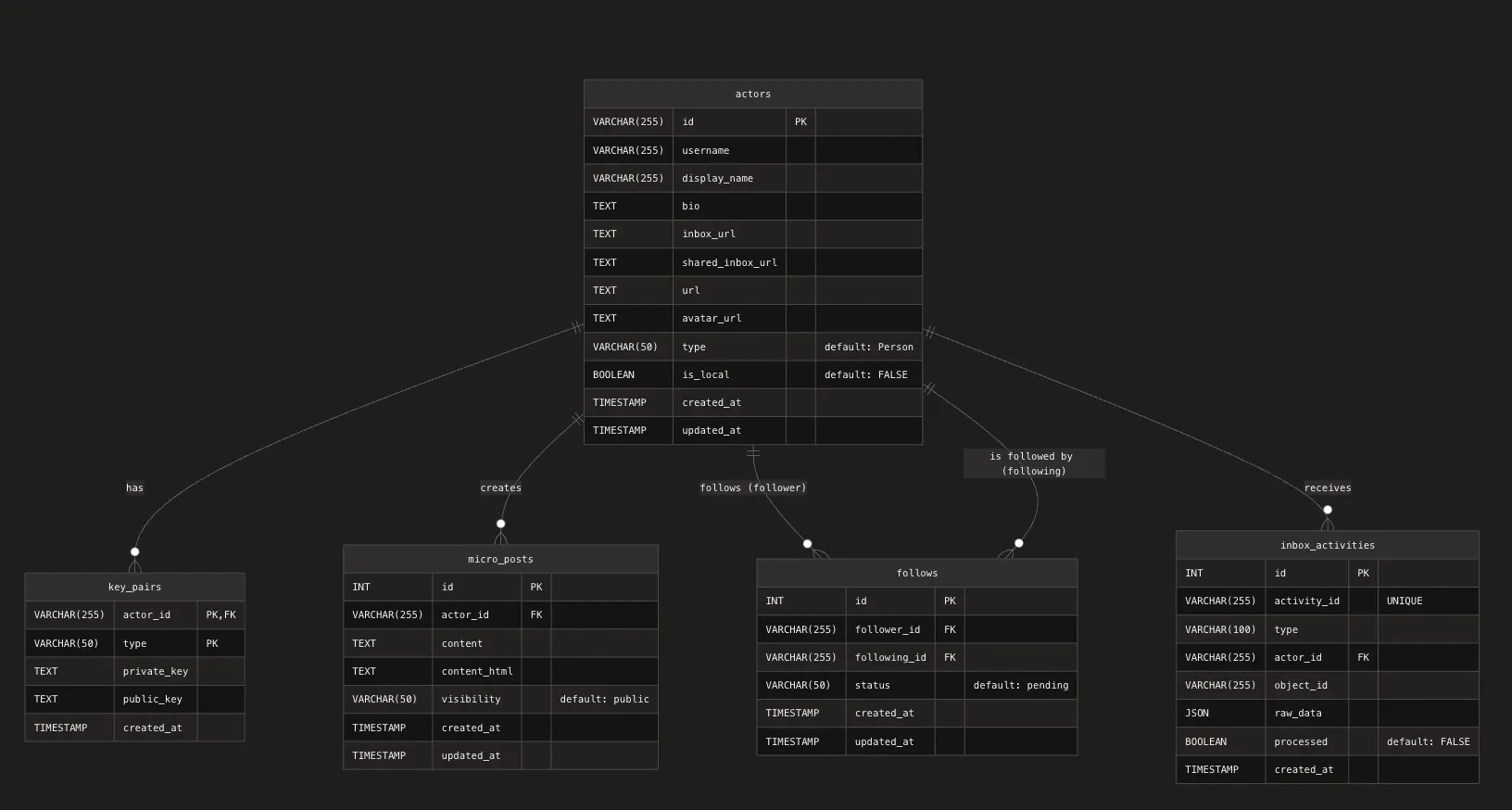 개인 웹 사이트에 ActivityPub 프로토콜을 구현하기 위해 아래와 같이 ERD를 구성했다.