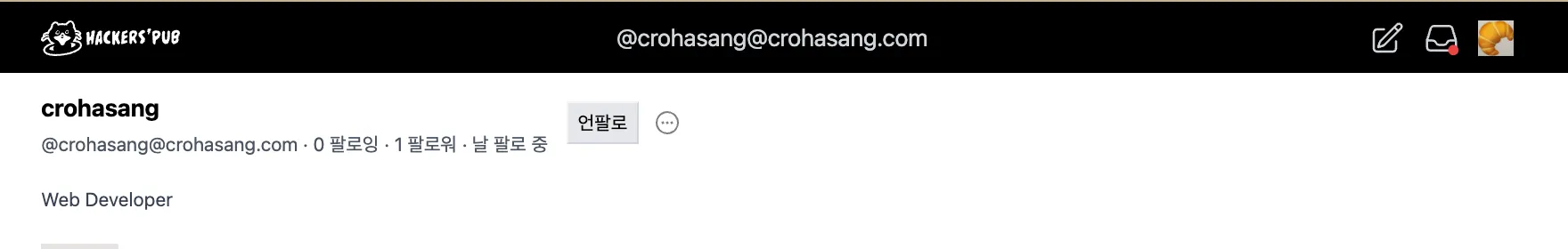 먼저 해커스펍에서 내가 만든 계정인 @crohasang@crohasang.com을 검색해보았다.