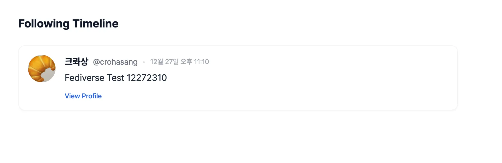계정 검색이 정상적으로 되는 것을 확인할 수 있었다. 이는 WebFinger 프로토콜이 제대로 작동하고 있으며, ActivityPub 프로필이 연합우주에 올바르게 등록되었다는 뜻이다.