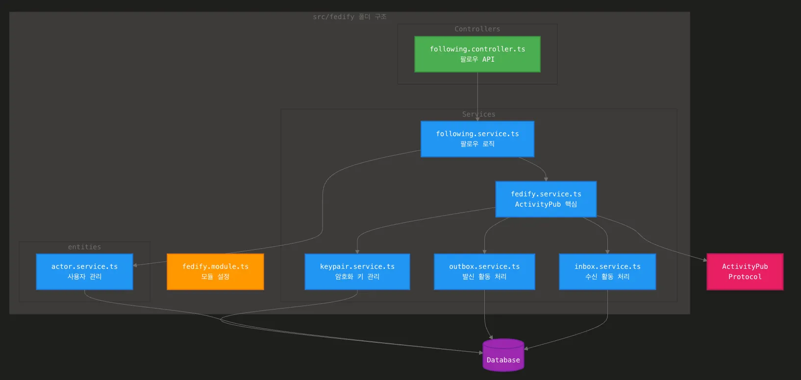 이번 작업을 통해 ActivityPub 프로토콜의 핵심 개념들을 이해할 수 있었고, Fedify 프레임워크를 실제 프로젝트에 적용하는 경험을 할 수 있었다. 또한 NestJS에서 기능별로 모듈과 서비스를 나누고, TypeORM으로 데이터베이스 마이그레이션을 관리하는 방법도 익힐 수 있었다. 아직 좋아요 같은 구현하지 못한 기능들이 남아있지만, 앞으로 천천히 추가해볼 예정이다.