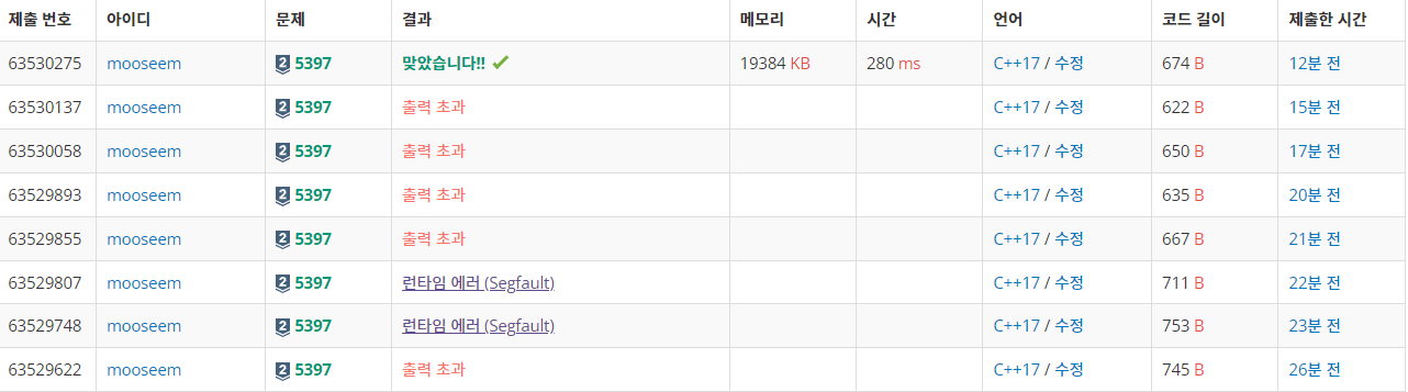 출력 초과와 런테임 에러가 발생해서 많이 당황했었다. 위에서 언급한 iter--;와 iter = a.erase(iter); 부분을 찾는 것이 힘들었다.