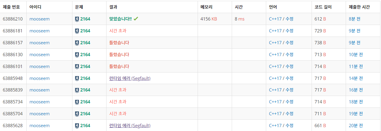 정답 처리 된 코드와 차이가 커보이지 않는다. 그렇다면 왜 이 코드만 시간 초과가 된걸까? 아직도 이유는 잘 모르겠다.