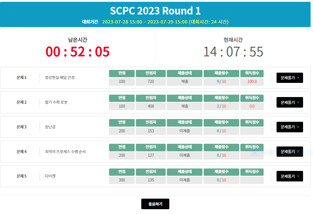 2번 문제는 아이디어가 어렴풋이 떠오르기는 했지만 구현을 못할 것 같기도 하고 남은 시간도 많지 않았기에 부분점수나 얻자는 마음으로 예제는 해결이 되지만 반례가 있는 코드를 짜서 제출했다. 하지만 부분점수는 얻지 못했고 오답 처리되었다. 3번, 4번, 5번은.. 문제를 읽고 풀 엄두가 나지 않았다.