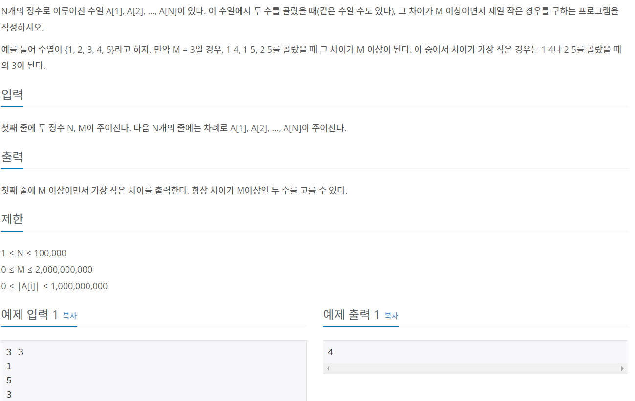 N개의 정수로 이루어진 수열 A[1], A[2], …, A[N]이 있다. 이 수열에서 두 수를 골랐을 때(같은 수일 수도 있다), 그 차이가 M 이상이면서 제일 작은 경우를 구하는 프로그램을 작성하시오. 예를 들어