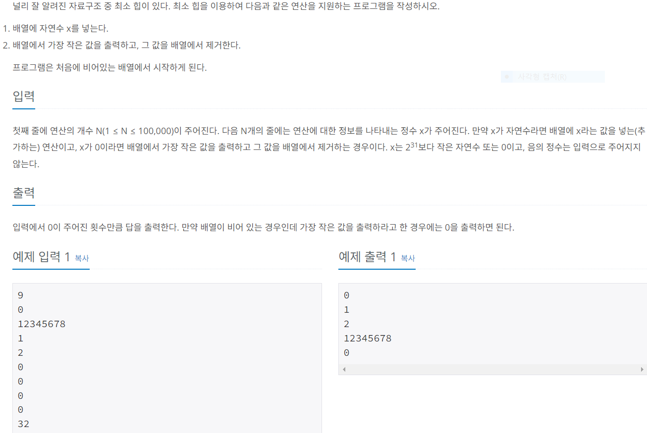 사실 이 문제의 목적은 직접 최소 힙을 구현하라는 것이지만,
