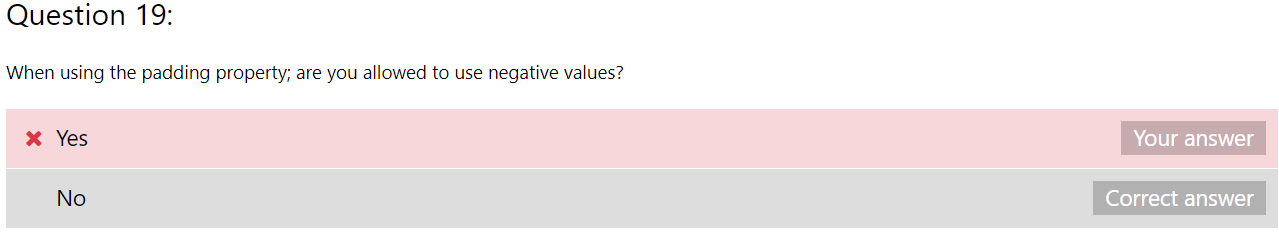 -> CSS에서 padding 속성은 요소의 콘텐츠와 테두리 사이의 간격을 조절하는 데 사용됩니다. 음수 값을 사용하여 padding 속성을 설정하는 것은 허용되지 않습니다.